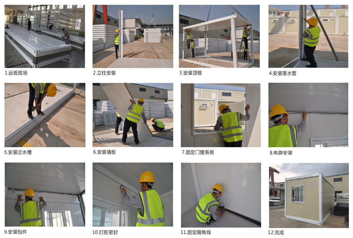 3、工廠預(yù)裝配,盡量減少現(xiàn)場的工作量:標(biāo)準(zhǔn)箱的頂框、底框包括裝飾層、電路都是在工廠裝配完成,現(xiàn)場將立柱和墻板用螺栓和頂?shù)卓蜻B接,將電路接線端依次接好,再將裝飾壓型件釘?shù)较鄳?yīng)位置,一個標(biāo)準(zhǔn)箱式房就組裝完成。