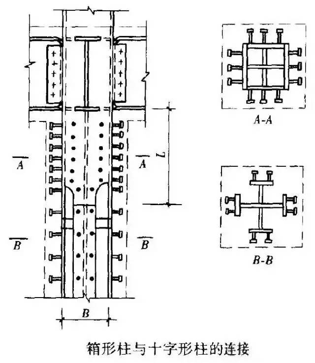 兩種截面的連接處,十字形柱的腹板應(yīng)伸入箱形柱內(nèi),形成兩種截面的過(guò)渡段。伸入長(zhǎng)度應(yīng)不小于柱寬加200mm,即L≥B+200mm,過(guò)渡段截面呈田字形。過(guò)渡段在主梁下并靠緊主梁。