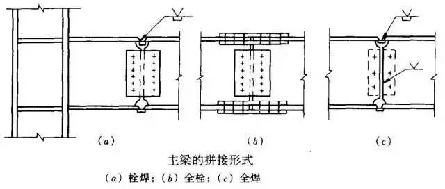 次梁與主梁的連接通常設(shè)計(jì)為鉸接,主梁作為次梁的支座,次梁可視作簡(jiǎn)支梁。其拼接形式如下圖所示,次梁腹板與主梁的豎向加勁板用高強(qiáng)度螺栓連接(圖a、b),當(dāng)次梁內(nèi)力和截面較小時(shí),也可直接與主梁腹板連接(圖c)。